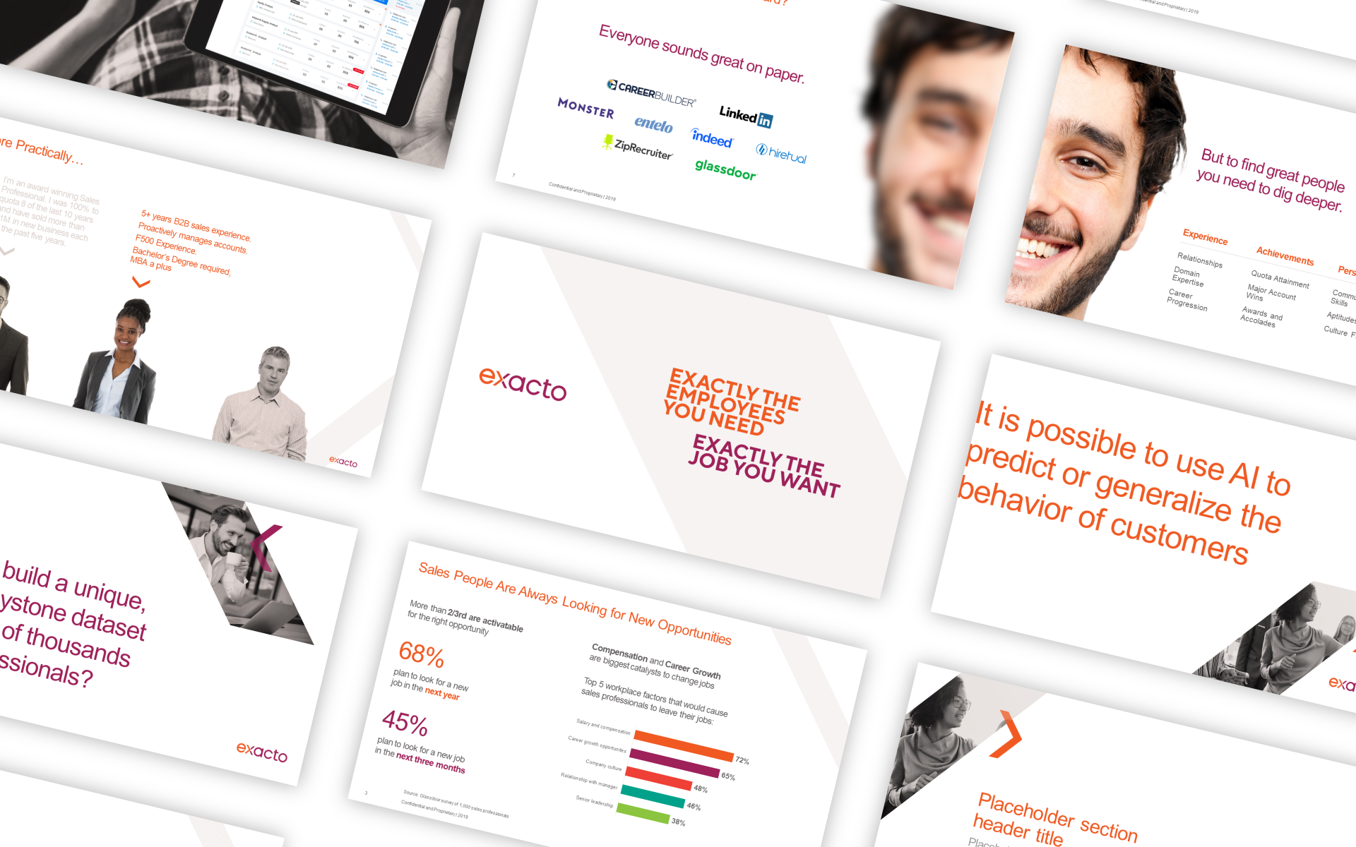 During the discover phase of this project the client repeated “the Uber of recruiting.” This led to an exploration that needed to still feel people focused with a modern aesthetic. Too many recruiting sites use the same cheese factor imagery, and there is an oversaturation of green and blue. The color palette needed to stand out as much as the design expression. Exacto desires to be the number one convergence of employers and job seekers.