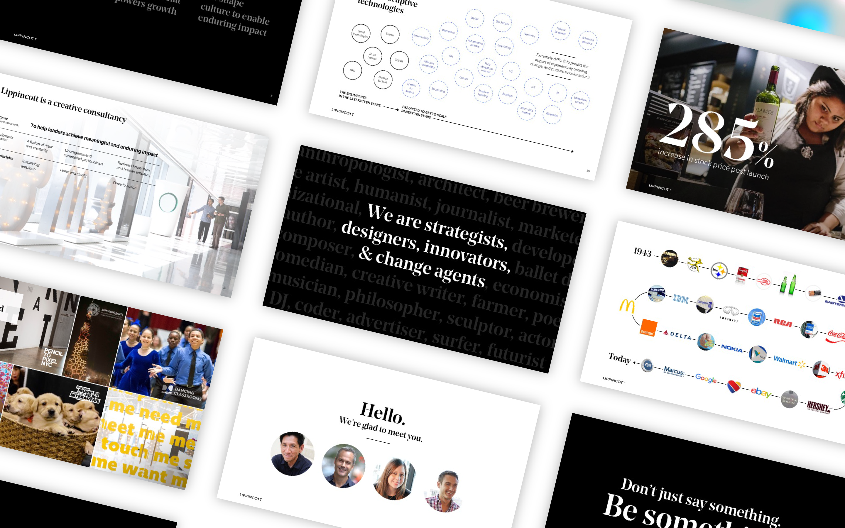 In 2016 Lippincott rebranded itself, and was in need of an updated PowerPoint template to compliment this new direction. The partners wanted a more editorial look and feel that made use of eye catching imagery and impactful content.